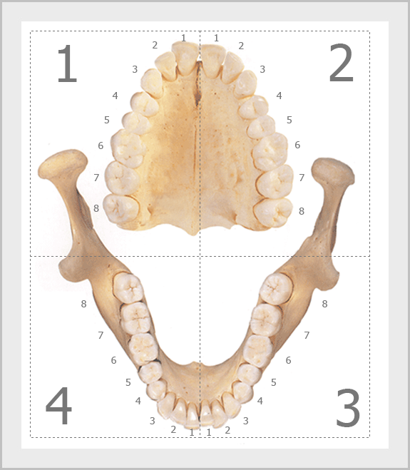 Благодаря знаниям в области расположения зубов у детей и взрослых, ученым удалось создать единую для всего мира зубную формулу. Она представляет собой графическое описание зубов обеих челюстей, где каждый зуб или группа имеют особой цифровое и буквенное обозначение.